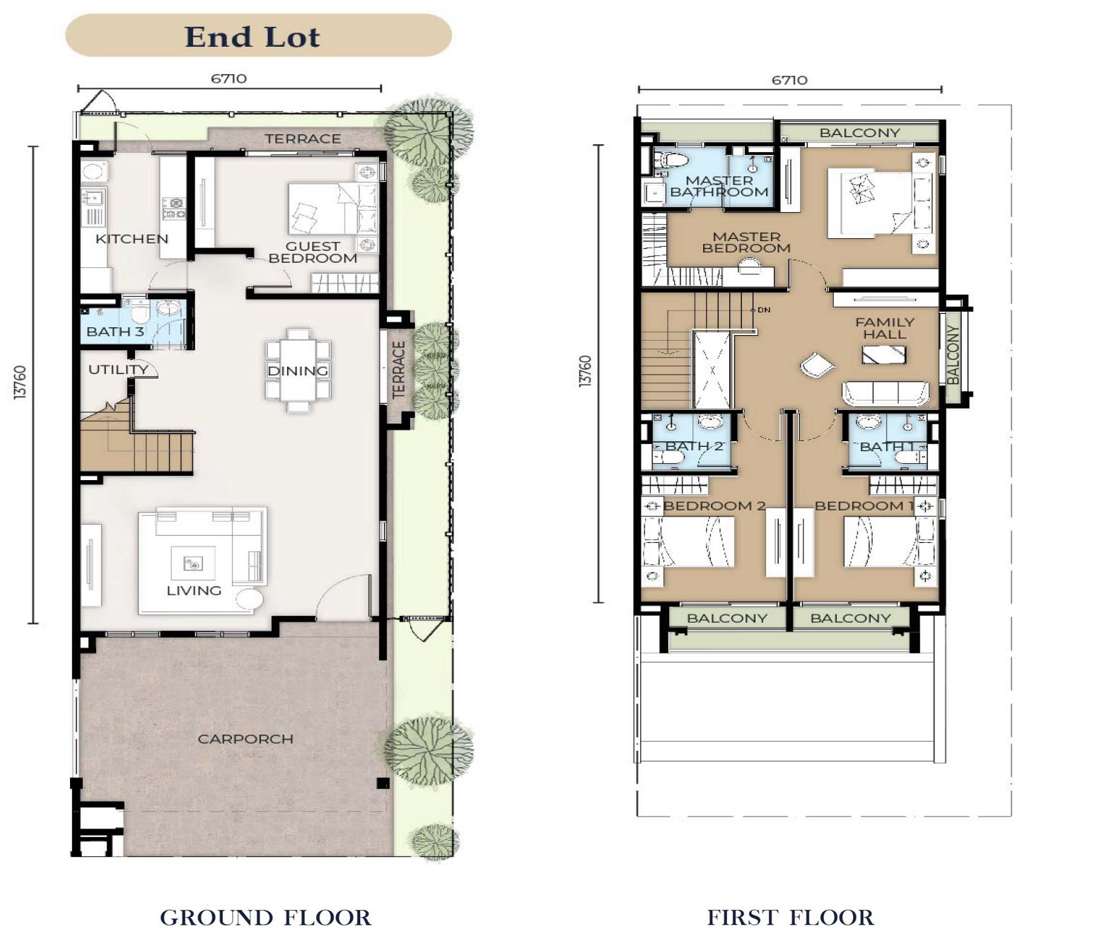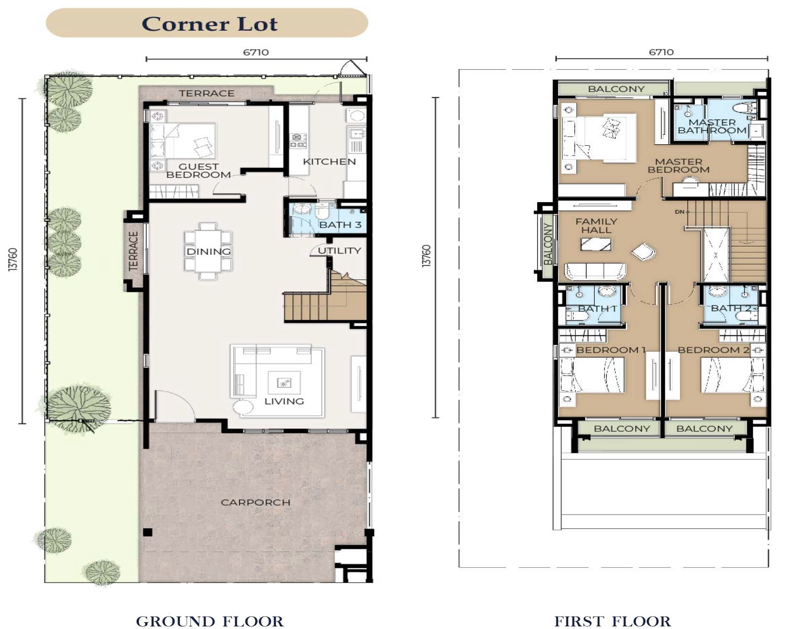 Master Bedroom, Bedroom 1, Bedroom 2, Family Hall, Staircase | Laminated Timber Flooring |