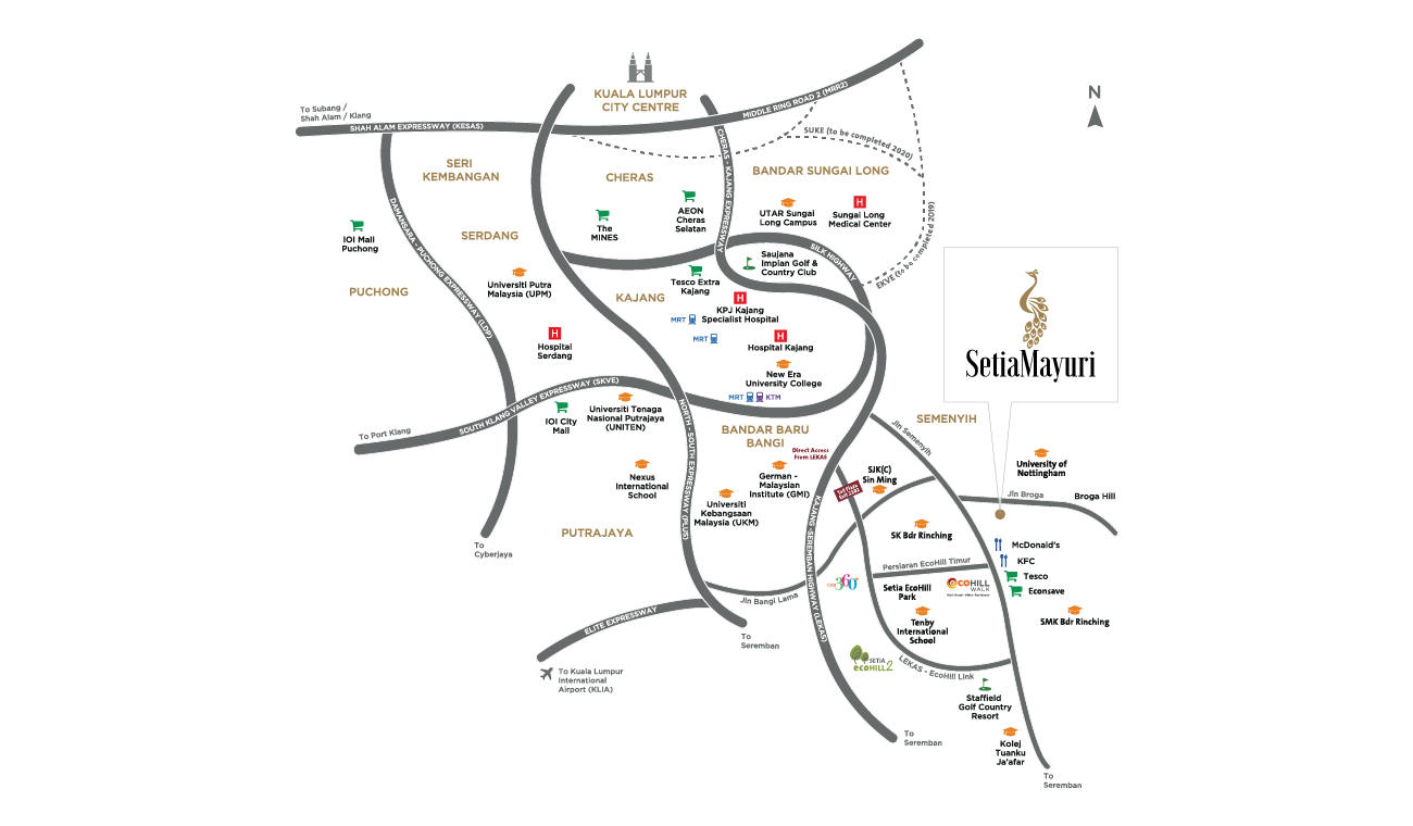 South of Klang Valley, Setia Mayuri is strategically located in the Kajang-Semenyih growth corridor close to Broga Hills. It is easily accessible via the Cheras-Kajang Expressway, SKVE (through SILK Highway) and LEKAS.